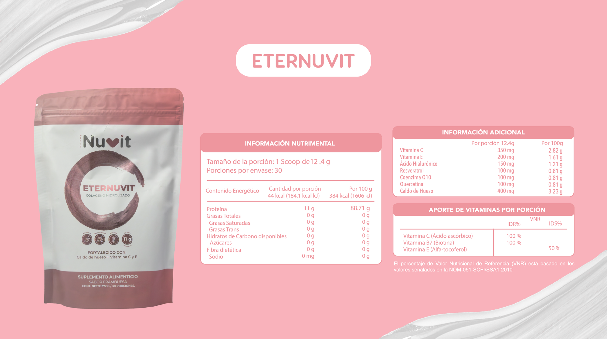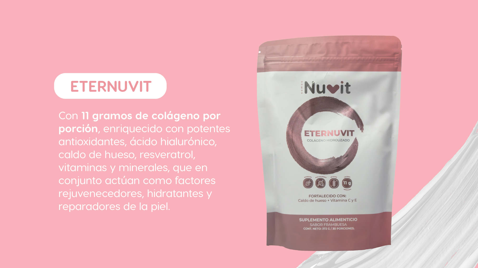 Además de aportar colágeno hidrolizado, que forma parte de huesos y articulaciones, Eternuvit contiene antioxidantes, ácido hialurónico y otros nutrientes que participan en procesos naturales relacionados con el bienestar y la apariencia de la piel.
