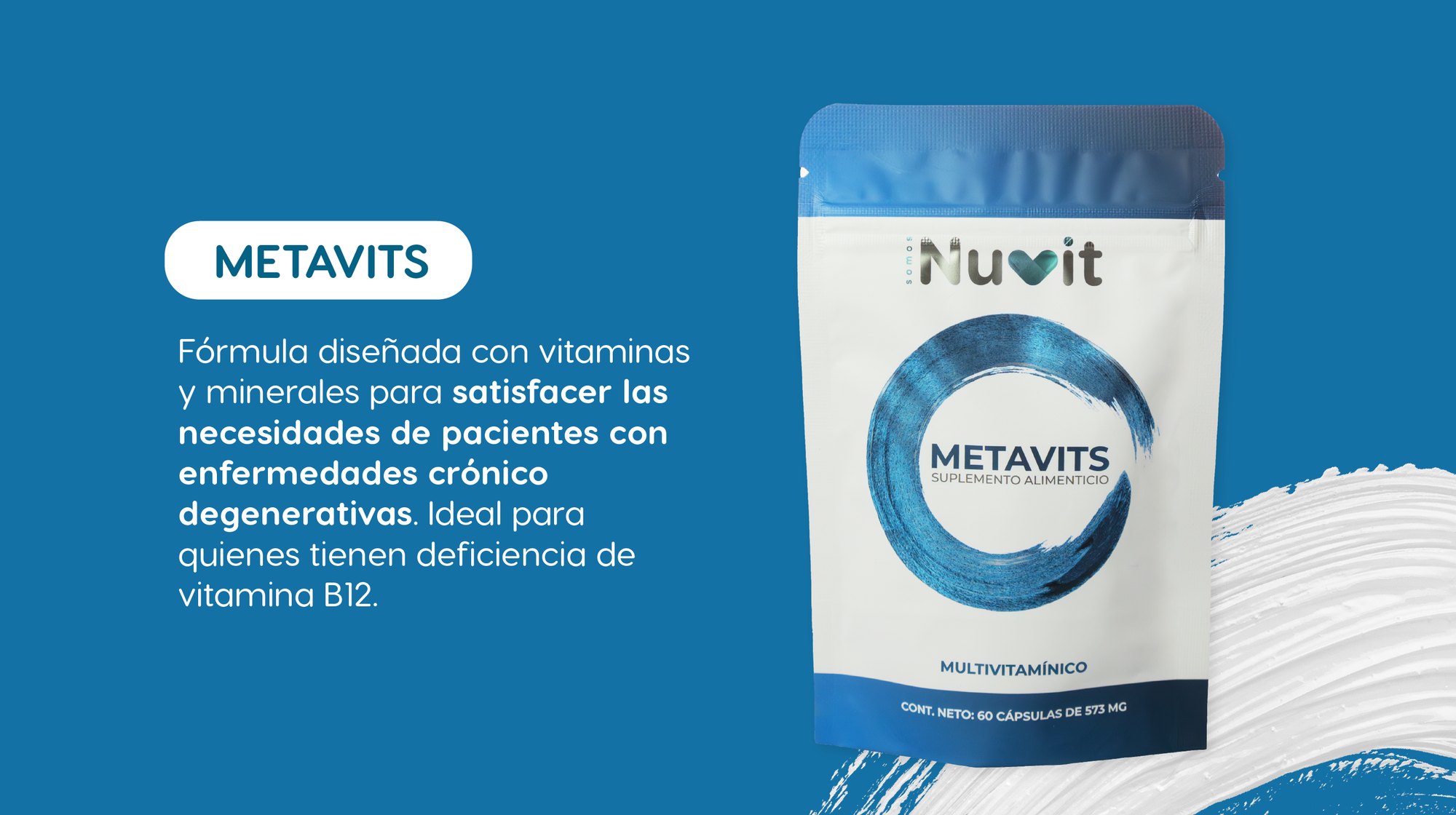 Metavits es una fórmula diseñada a base de vitaminas y minerales con el objetivo de cumplir con los requerimientos en pacientes con enfermedades crónicas degenerativas.