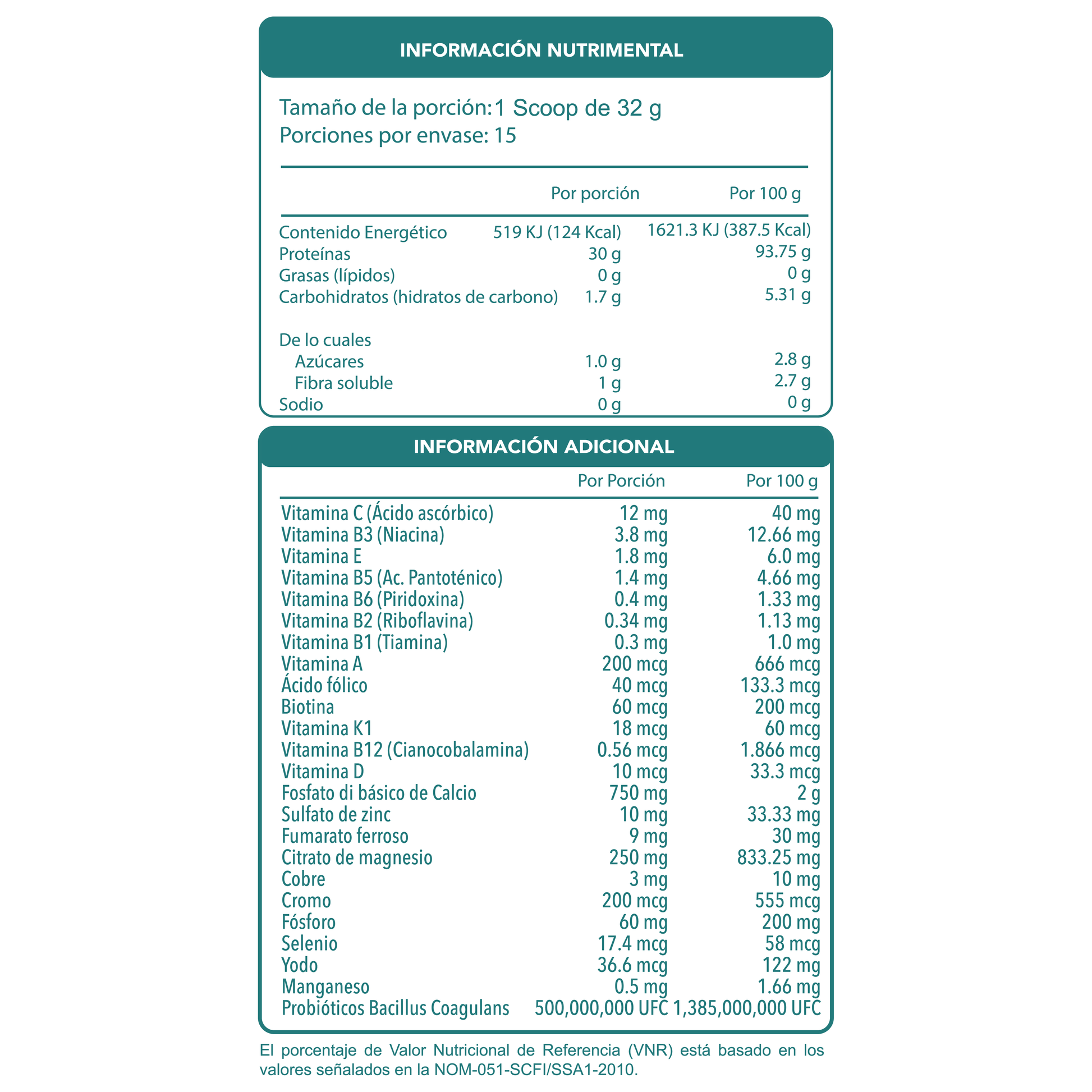Concentrado de proteína de suero de leche (WPC Whey), colágeno hidrolizado bovino, inulina de agave, sabor chocolate, fosfato dibásico de calcio, sulfato de manganeso, vitamina C, cúrcuma (Curcuma longa), fumarato ferroso, vitamina E, vitamina B3 (niacina), sulfato de zinc, vitamina B5 (ácido pantoténico), vitamina B2 (riboflavina), ácido fólico, biotina, vitamina K, fruto del monje, vitamina B1 (tiamina), vitamina B6 (piridoxina), vitamina B12 (cianocobalamina), vitamina D, cobre, yodo, citrato de magnesio, fósforo, selenio, cromo, probióticos Bacillus coagulans GBI-3096 y cocoa.