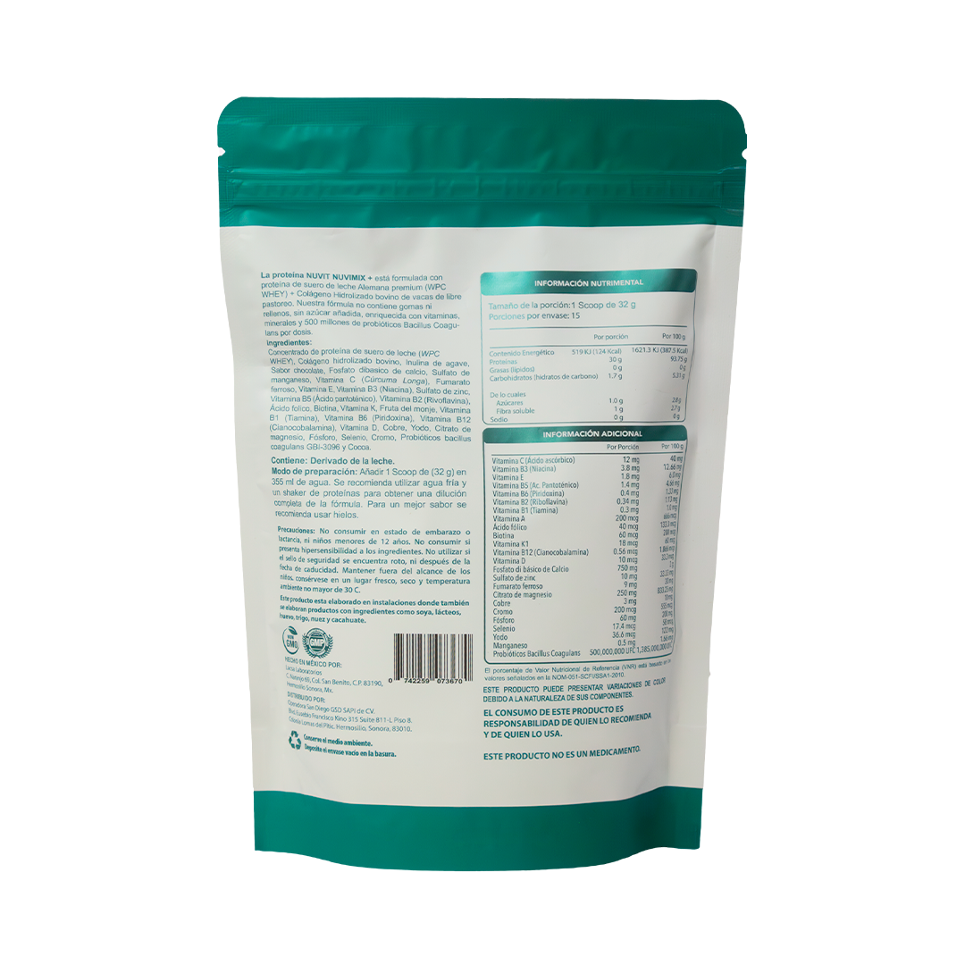 Nuvimix+ está formulada con proteína de suero de leche alemana (WPC), probióticos Bacillus coagulans, hierro (fumarato ferroso), además de vitaminas y minerales esenciales. Una fórmula diseñada para acompañar tu bienestar y complementar tu alimentación diaria, con un delicioso sabor a chocolate.